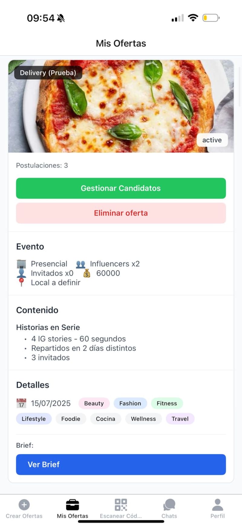También se puede definir la categoría de influencer requerida y las plataformas donde se espera que se publique el contenido. Una vez publicada la propuesta, los influencers interesados pueden postularse, y la empresa selecciona el perfil que considere más adecuado.