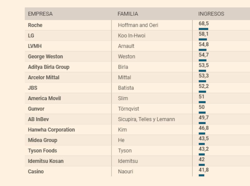 Le siguen por facturación en el ránking de las empresas familiares más poderosas la farmacéutica suiza Roche; la surcoreana LG; LVMH, que aglutina 76 marcas de lujo y es la empresa familiar más grande de Francia; George Weston, un grupo empresarial canadiense que controla la británica Associated British Food (ABF), el dueño de Primark; el conglomerado indio Aditya Birla; ArcelorMittal, la mayor siderúrgica del mundo, que forma parte de lbex 35 y es la única empresa del 'top 100' que tiene su sede en Luxemburgo; la compañía de alimentación JBS, del clan familiar Batista y única representante de Brasil en este listado; la 'teleco' América Móvil del magnate Carlos Slim; y la energética suiza Gunvor.