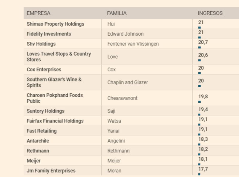 Entre las 25 firmas no cotizadas restantes que figuran en este listado se encuentran las estadounidenses Pilot, C&S Wholesale Grocers, Enterprise Holding, Fidelity Investments, Loves Travel Stop & Country Stores, Cox, Southern Glazers Wine & Spirits, Meijer, JM Family y Bechtel; las alemanas Heraeus, CH Boehringer Sohn, Bertelsmann, Rethmann, Adolf Würt y Otto; las francesas Société de Négoce et de Participation (Sonepar) y el grupo Lactalis; las neerlandesas BCD y SHV Holdings; la japonesa Suntory; la italiana Edizione (de los Benetton); la suiza Tetra Laval; y la argentina Techint.