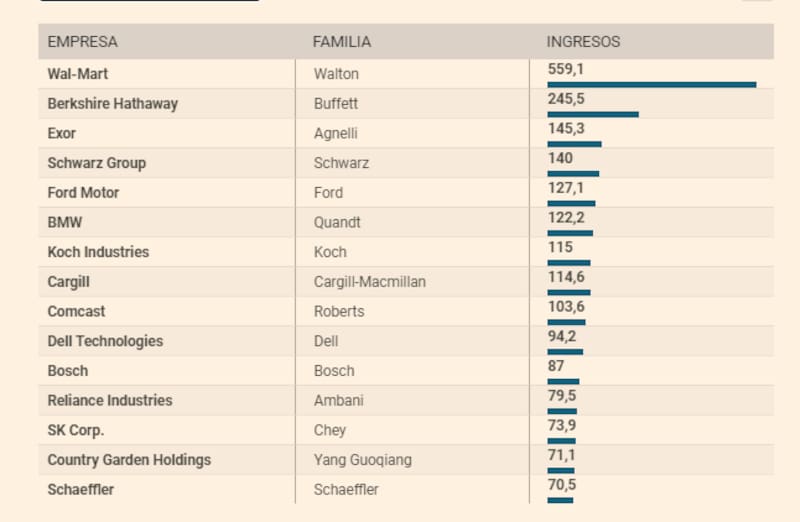 El 'top ten' de las mayores empresas familiares del mundo, un ránking elaborado con datos de la consultora EY en colaboración con la universidad suiza de St.Gallen y analizado por EXPANSIÓN, está formado por WalMart, Berkshire Hathaway, Exor, Schwarz, Ford Motor, BMW, Koch Indstries, Cargill, Comcast y Dell.
