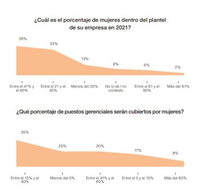 El tema de la paridad de género en los ámbitos laborales está cada vez más presente y, aunque es un proceso lento, se consolida. Los empresarios declaran en esta encuesta anónima y confidencial que un 39% tiene en sus plantillas entre un 41% y un 60% de mujeres, lo que indica índices de paridad aceptables. Un 46% declara menos que un 40% y un 8% más del 60%. Sin embargo, para 2022 los números pasarán al 42% para el primer ítem, un 37% para el segundo y un 10% para el tercero. Lo que indica una tendencia sólida.