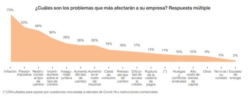 El problema del tipo de cambio, tanto en su variante restricciones al acceso (48% de los consultados), como en la incertidumbre sobre su variación (36%), el aumento del tipo de cambio (26%) o el retraso del tipo de cambio (18%), es la otra gran preocupación. Con un 28% figura el tema de la inseguridad jurídica y con un 26% de las respuestas el aumento del costo de los insumos. El 19% ve como un problema la caída del consumo y el 17% las dificultades del acceso al crédito.