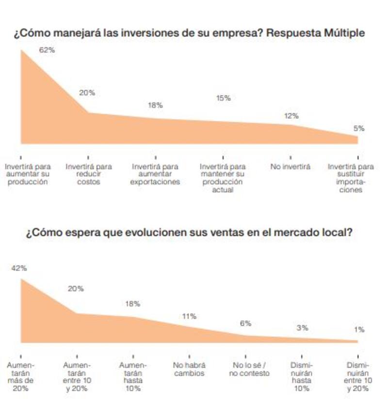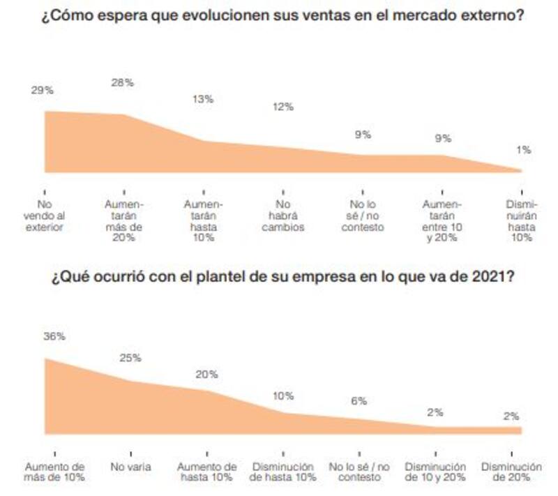 El 42% con un aumento mayor al 20% y el 38% con mejoras menores a ese número. Sólo un 4% ve una caída. En cuanto a las exportaciones, y tomando en cuenta que el 29% de las empresas que contestaron no exportan -en muchos casos porque se dedican a servicios- y el 9% no opinó, el 28% contestó que las aumentará más del 20% y un 22% menos de ese número. Sólo el 1% piensa en reducirlas.