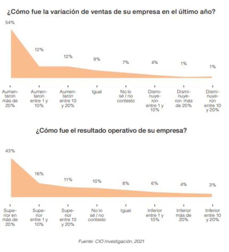Yendo al detalle, el 54% respondió que las ventas aumentaron más del 20%, un 12% aseguró que crecieron entre un 10 y un 20% y otro 12% dijo que subieron entre un 1 y un 10%. Sólo el 6% acusó pérdidas y un 9% cantó paridad. En tanto, el resultado operativo para 2021 obtuvo un resultado similar. Un 43% dijo que el crecimiento fue mayor al 20%, el 11% que varió entre un 10 y un 20% y otro 16% creció entre 1 y 10%. Un 13% aseguró una caída.