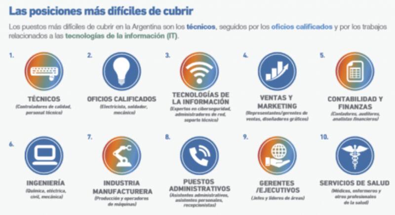El estudio revela que los puestos con mayor demanda en nuestro país son los técnicos como, por ejemplo, controladores de calidad. En segundo lugar, electricistas, soldadores y mecánicos como también otros oficios calificados presentan dificultades para los empleadores. La especialización en tecnologías de la información (IT), programación, ciberseguridad y soporte técnico también causa dolores de cabeza a las empresas a raíz de que muchas veces la oferta de capital humano disponible en estos sectores es baja.