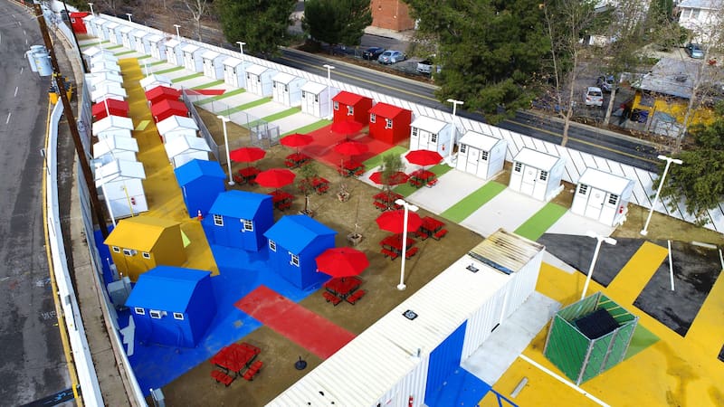 Diseñada por Leherer Architects, esta colorida aldea se construyó en apenas 13 semanas y es hoy el núcleo de la estrategia de la ciudad para dar techo a quienes carecen de él. En total, los 39 refugios prefabricados tienen cada uno capacidad para 2 personas, con lo que la zona puede acoger a unas 80 personas.