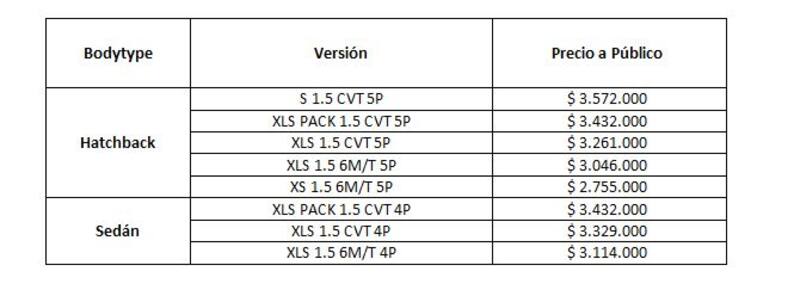 Los precios sugeridos son los siguientes: para los hatchback, XS 6 MT, $ 2.755.000; XLS 6 MT, $ 3.046.000; XLS CVT, $ 3.261.000; XLS Pack CVT, $ 3.432.000; y S, $ 3.572.000. Para los sedanes: XLS 6 MT, $ 3.114.000; XLS CVT, $ 3.329.000; y XLS Pack CVT, $ 3.432.000.