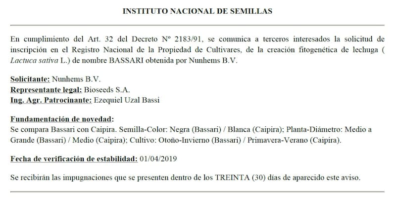 En cumplimiento del Art. 32 del Decreto N° 2183/91, se comunica a terceros interesados la solicitud de inscripción en el Registro Nacional de la Propiedad de Cultivares, de la creación fitogenética de lechuga (Kactyca satuva L.) de nombre BASSARI obtenida por Nunhems B..V.