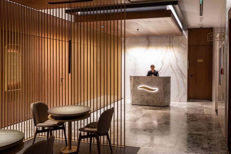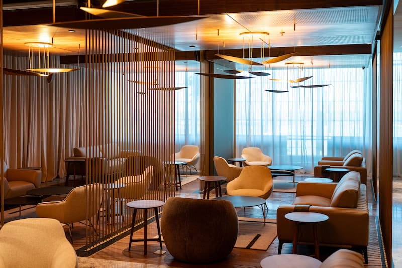 El salón, de 780 metros cuadrados distribuidos en tres niveles, incorpora diferentes sectores adaptados a las necesidades del viajero. Hay zonas exclusivas para trabajar, comer o descansar, todas equipadas con mobiliario de diseño, iluminación tenue y materiales que buscan generar un espacio silencioso y confortable. También se incluyen baños con duchas, conexión Wi-Fi de alta velocidad, salas silenciosas y exhibiciones de arte.