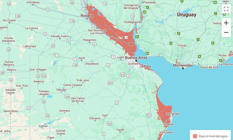 Según un estudio de la organización Climate Central, la Argentina, como todos los países costeros, no escapa a este riesgo. Una de las áreas más vulnerables es la costa atlántica de la provincia de Buenos Aires, que abarca ciudades como Mar del Plata, Pinamar y Villa Gesell. Además, incluye municipios del conurbano, tales como Berazategui, Ensenada, Florencio Varela, Lanús y Quilmes.