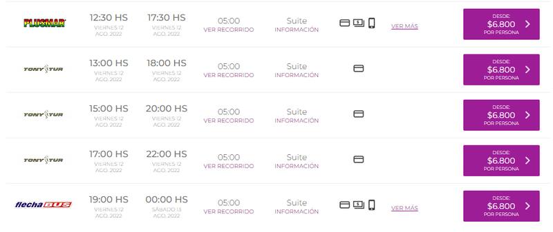 En cuanto al servicio de suite, los pasajes están $ 6.800 y lo ofrecen las siguientes empresas: Plusmar, Tony Tours y Flecha Bus.