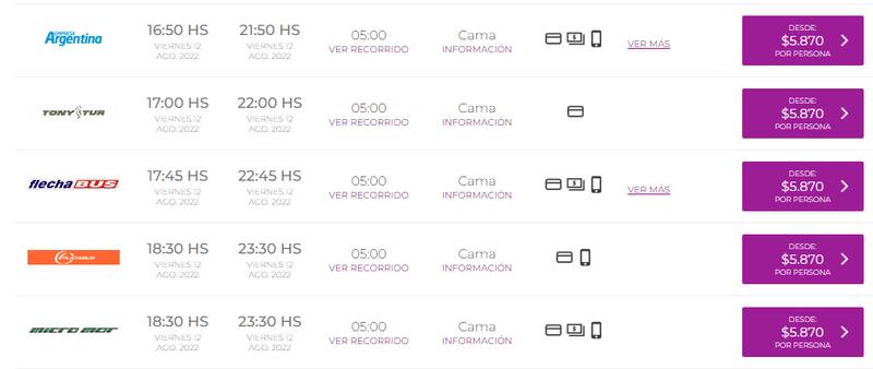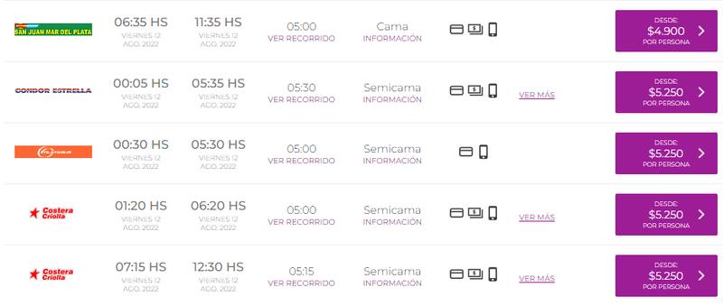 Pasadas las 17 horas, además de Flecha Bus otras de las empresas con destino a Mar del Plata son Tony Tours, Plata Bus o Micro Mar que ofrecen un servicio de cama con pasajes a $ 5.870.