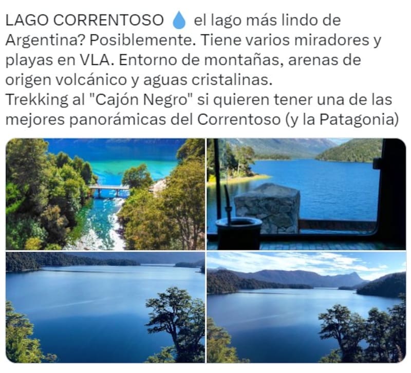"¿El lago más lindo de Argentina? Posiblemente. Tiene varios miradores y playas en VLA. Entorno de montañas, arenas de origen volcánico y aguas cristalinas. Trekking al "Cajón Negro" si quieren tener una de las mejores panorámicas del Correntoso (y la Patagonia)", dice Rodríguez.