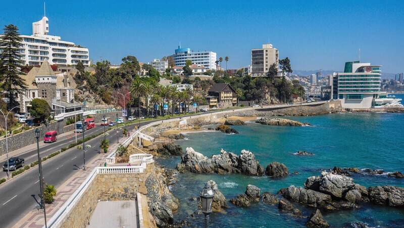 Del otro lado de la bahía descansa Viña del Mar, engalanada desde su entrada con los jardines del Casino, fundado en 1930. Vale la pena detenerse ante edificios como el Palacio Carrasco y el Palacio Rioja, ambos de principios del siglo pasado. El aristocrático Cerro Castillo, donde se yergue la residencia presidencial de fin de semana, es otro paseo que no tiene desperdicio por la historia y por las panorámicas que brinda.