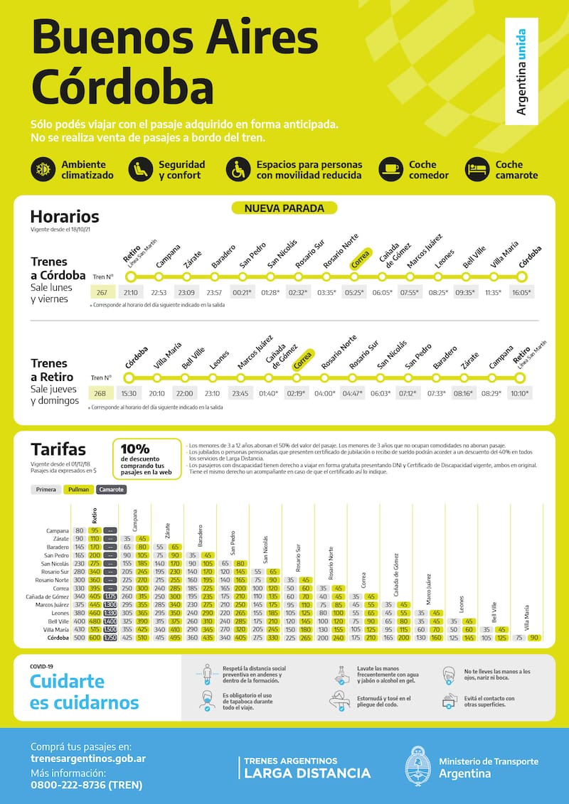 El trayecto que une Buenos Aires - Córdoba parte de la estación Retiro San Martín y cuenta con dos servicios semanales: lunes y viernes a las 21.10 y desde Córdoba los jueves y domingos a las 15.30.