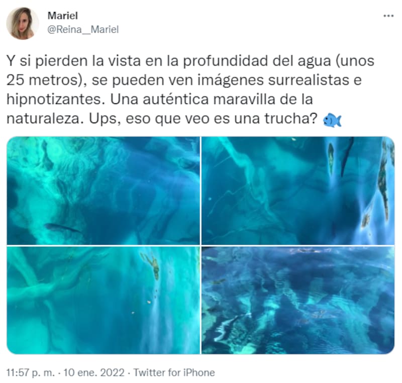"Y si pierden la vista en la profundidad del agua (unos 25 metros), se pueden ver imágenes surrealistas e hipnotizantes. Una auténtica maravilla de la naturaleza", destacó la usuaria @Reina__Mariel en Twitter.