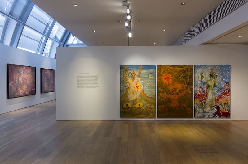 Villanueva y León De la Barra dejaron de lado la cronología y plantearon una muestra por ejes temáticos. Esta su serie ochentosa dedicada a la Guerra de Malvinas, sus autorretratos hogareños atravesados por los ritos católicos, sus indagaciones sobre el ser latinoamericano y la influencia de las misiones jesuíticas, la naturaleza como espacio de libertad, la ciudad y la intolerancia sexual y la martirización, entre otros.