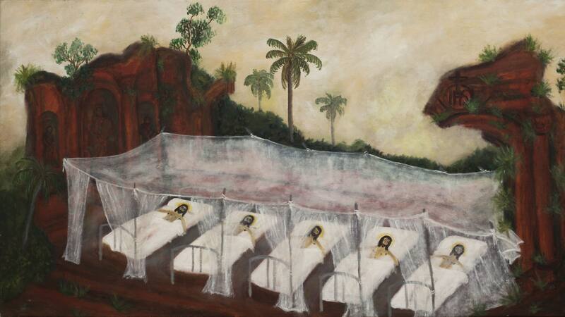 Los curadores proponen observar más allá de las características naif que siempre lo han acompañado producto de incluir imaginario religioso y costumbrista en sus trabajos. Nos ofrecen experimentar a García Sáenz en su tiempo: la apertura sexual de los '80 que se empañó con el avance del VIH, y la post-fiesta de los sobrevivientes.