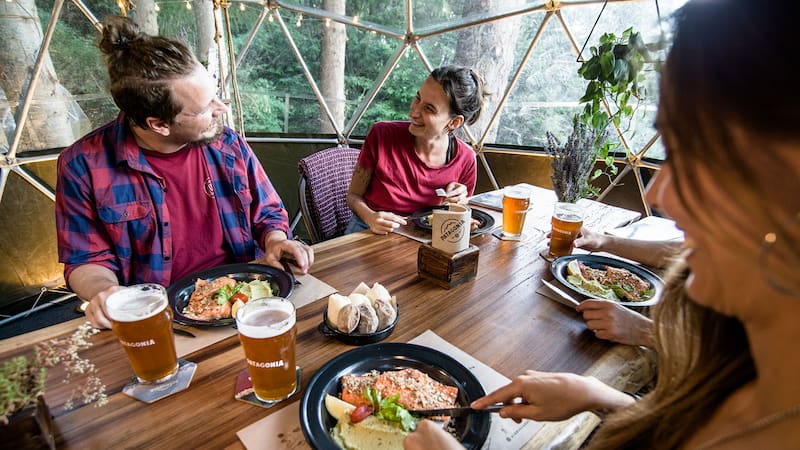Cerveza Patagonia tiene su microcervecería en el kilómetro 24.7 de Circuito Chico: un predio espectacular frente al Lago Moreno donde se puede comer, picar y tomar algo en su gran jardín cervecero, en su restaurante o en sus domos en medio del bosque (una propuesta que debutó en el invierno y continúa en el verano).