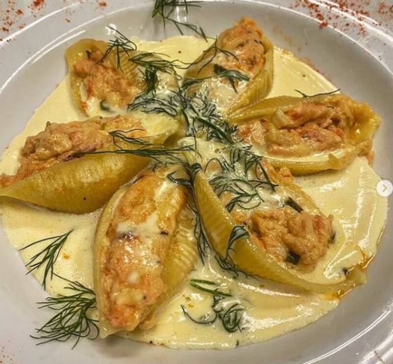 - Conchiglioni italianos rellenos de ricota y espinacas, con tuco y gratinados.