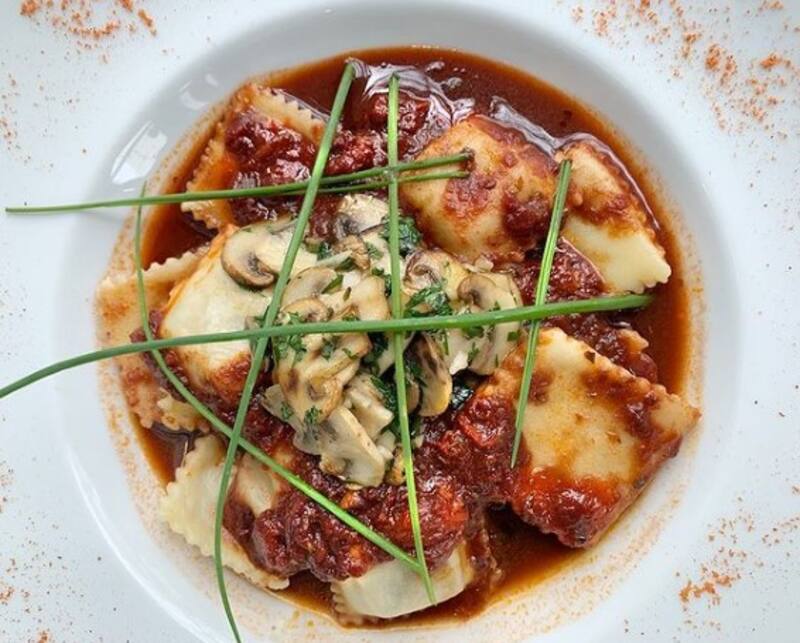 - Sorrentinos verdes de queso de cabra, tomates secos y espinaca.
