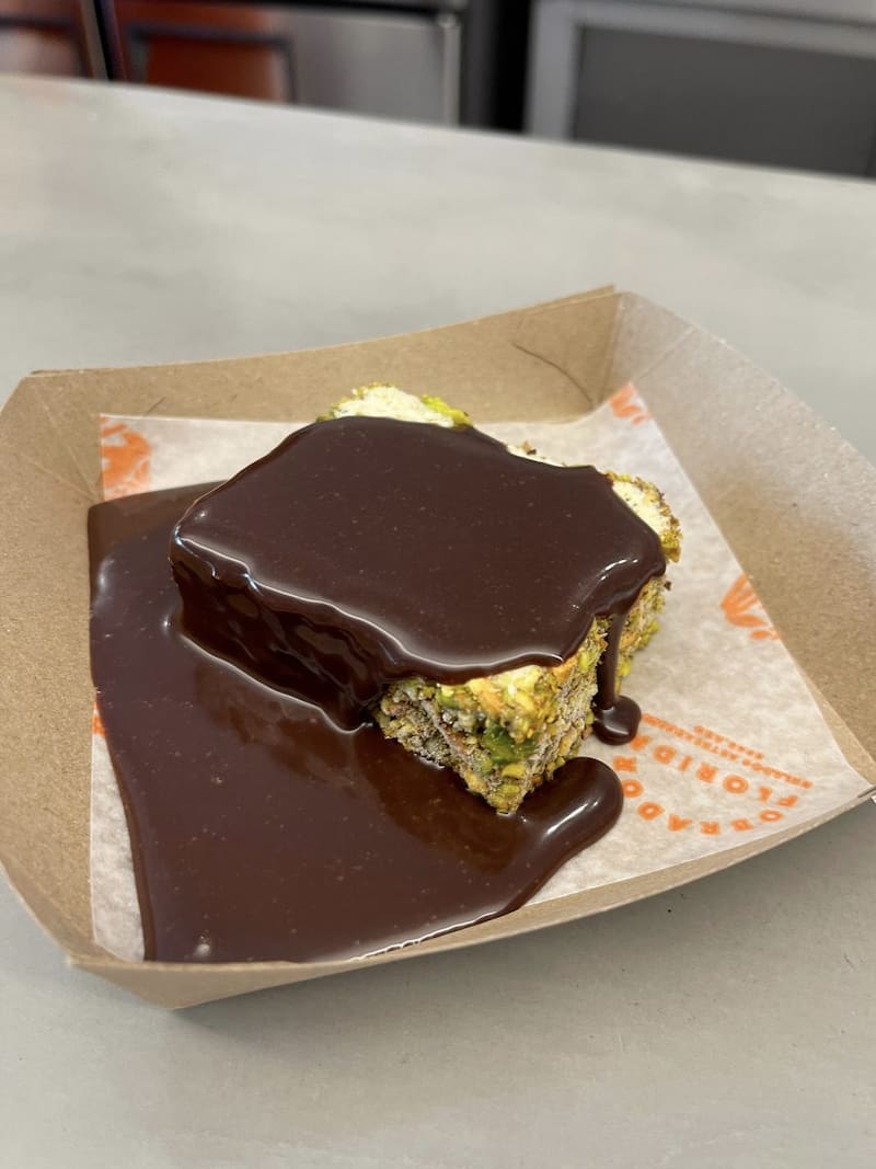 La carta es acotada: chocolate Kuyay nativo amazónico, pistacho y sambayón, y a veces suman algunos estacionales como naranja sanguina o yogur de búfala. Para el helado de chocolate usan granos de cacao traídos de Perú. El "licor" (chocolate fundido del grano) se usa en la base y los granitos que lleva, similar a un granizado, son nibs de cacao procesados más pequeños. Para el helado de pistacho (y su clásica galletita rellena) usan pistachos de San Juan. Es el único de los 3 sabores que lleva toppings y son totalmente naturales: pistachos garrapiñados.