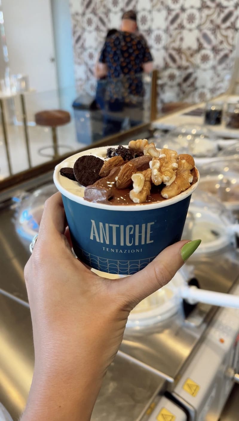 Además, siguiendo sus orígenes, Antiche brinda una experiencia italiana, no solamente con el helado, si no con los otros productos que acompañan: ofrece semi fríos (conceptos de postres italianos) y bocados para llevar