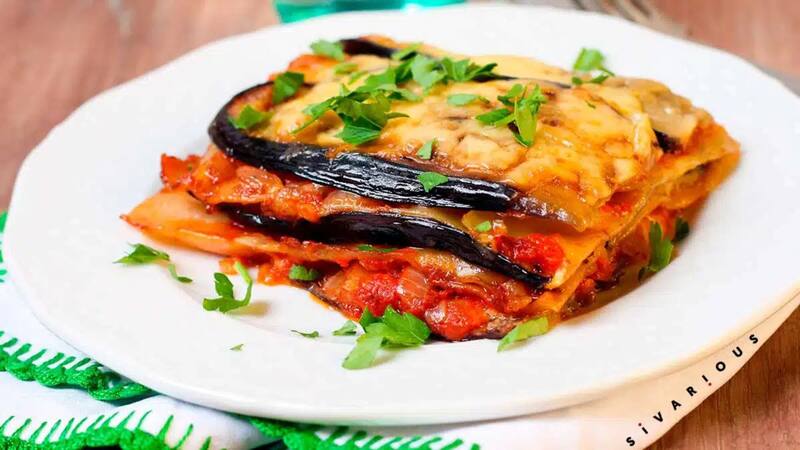Una versión sin carne de la clásica lasaña, utilizando berenjenas en lugar de pasta y un delicioso pisto de verduras como relleno.