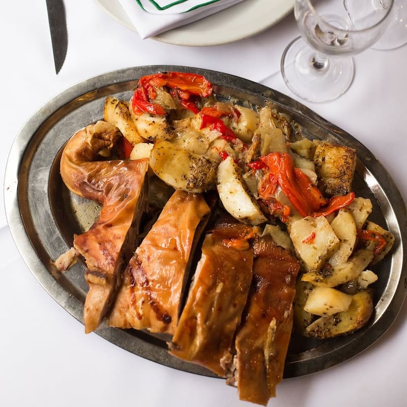 Entre los destacados no falla el puchero de tres carnes: gallina, vaca y cerdo. De hecho, en sus primeros años de existencia, ese era el único plato que se servía en este restaurante. También destacan su famoso cochinillo, el matambre casero, el revuelto gramajo y los canelones de verdura.