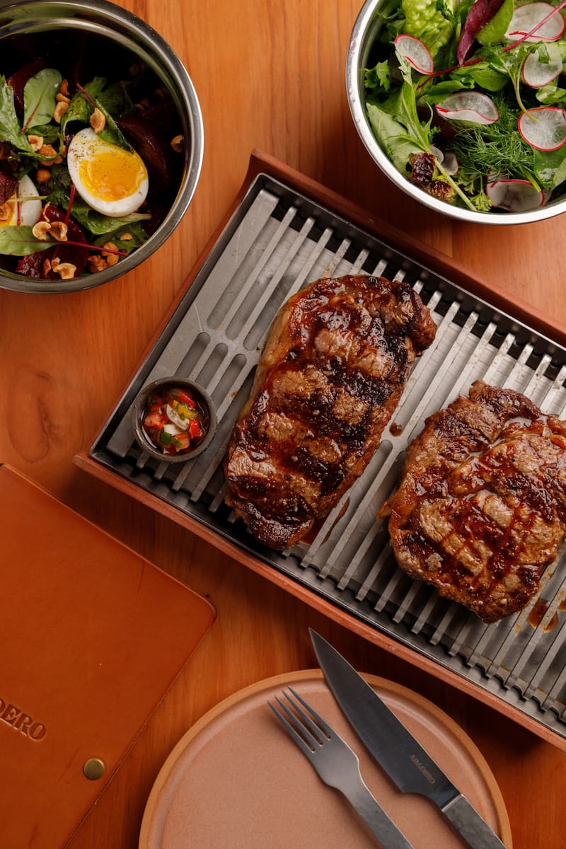 Entre las entradas se distinguen una fainá con txistorra y orégano fresco o una humita con galleta. Para seguir, entraña o T-bone a la parrilla con una ensalada de verdes de la huerta o de chauchas, jamón crudo y queso de cabra. Para terminar, el clafoutis de frutas de temporada al horno de barro.