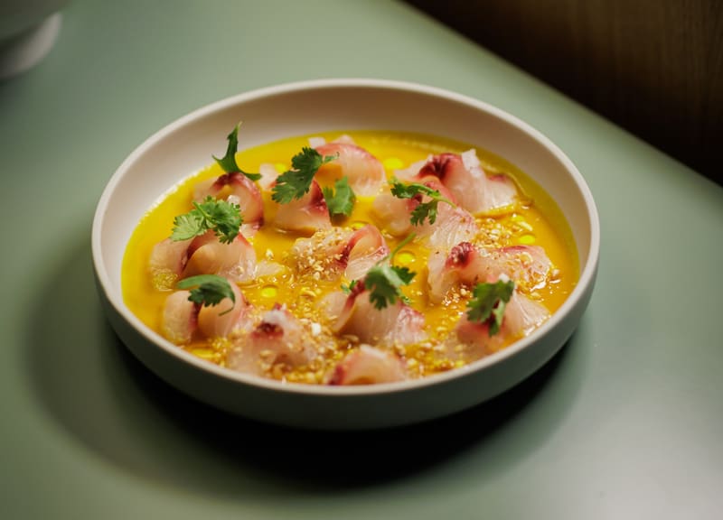 También, cuentan con pejerrey hecho boquerón y crudo de chernia con ajoblanco, cebolla morada, alcaparras, uvas verdes y manzanas. Con un toque peruano, ofrecen langostinos a la huancaína con boniatos fritos. Para sumar sabores orientales, tienen una opción caliente que consta de pesca marinada en miso y manteca con dashi.