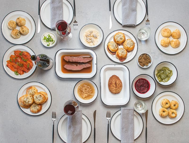 La caja para 4 personas incluye: 8 pletzalej, 8 knishes de papa, Arenque marinado, queso cebollitas, babaganoush, pescado al horno, jrein, guefilte fish, pastrón 800 gr, farfalaj, graten de papas, mostaza antigua y pickle de pepinos. De postre, strudel de manzana, torta de queso y torta oriental. El menú cuesta $ 32.000 con tarjeta de crédito y $ 28.800 en efectivo.