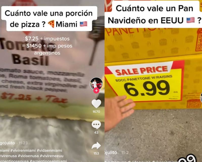 Dentro de los Estados Unidos, Miami es una de las ciudades más caras, y claro está que todo se vuelve más caro cuando se hace la conversión a pesos. Por ejemplo, en uno de sus videos el creador de contenido muestra que una porción - sí, solo una - de pizza sale u$s 7.25, lo cual, al valor del blue, equivale a $ 1439. Para darse una idea, una pizza entera de las pizzerías más conocidas de Buenos Aires se encuentra entre los $ 900 y los $ 1300.