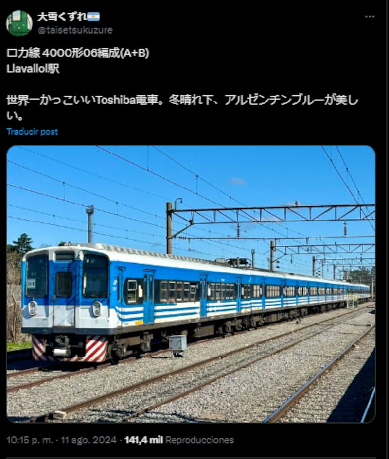 "El tren Toshiba más genial del mundo. Hermoso azul argentino en un claro día de invierno", expresó.