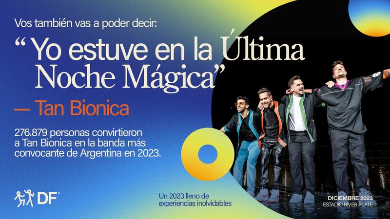 Uno de los propósitos más importantes de DF Entertainment siempre ha sido el apoyo y la celebración del enorme talento que hay en Argentina. En 2023, fueron la productora responsable por uno de los regresos más esperados de todos los tiempos, el de Tan Biónica en su épica gira de despedida. Con Shows en Vélez, Estadio Único, River y múltiples venues del interior, la banda que marcó la música argentina de las últimas dos décadas fue la que más tickets vendió, superando las 270.000 localidades.