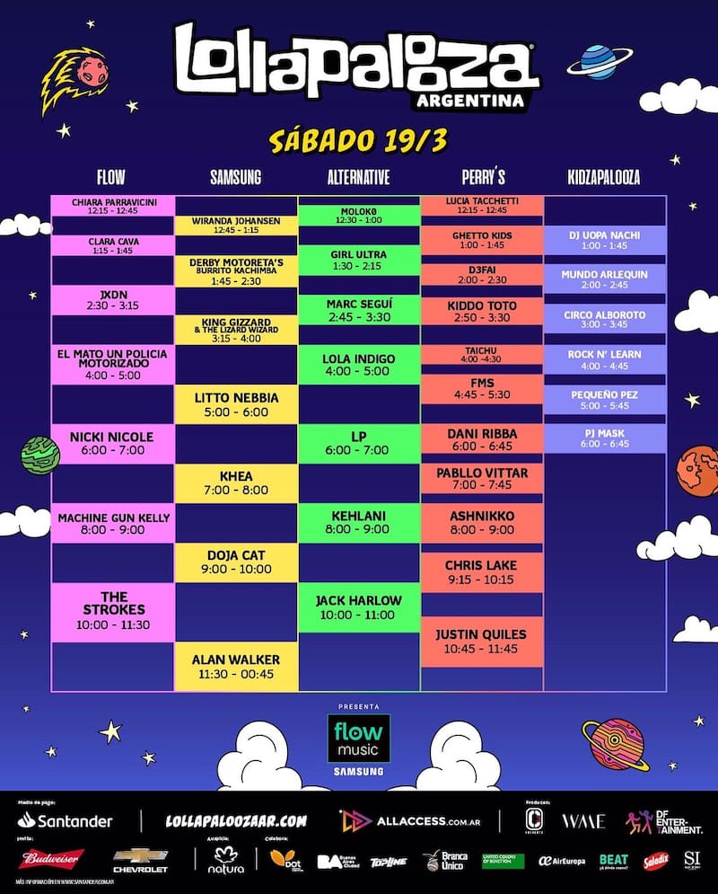 El sábado 19 continúa con The Strokes, Doja Cat, Machine Gun Kelly, Jack Harlow, Alan Walker, Khea, Kehlani, Nicki Nicole, Justin Quiles, LP, Litto Nebbia, Él Mató a un Policía Motorizado, Chris Lake, King Gizzard & the Lizard Wizard, Ashnikko, Dani Ribba JXDN, FMS, Natanael Cano, Pabblo Vittar, Marc Seguí. Derby Motoreta's Burrito Kachimba | Taichu, Kiddo Toto, Clara Cava, Girl Ultra, Ghetto Kids, Molok0, Chiara Parravicini, wiranda johansen, Lucia Tacchetti y D3FA.
