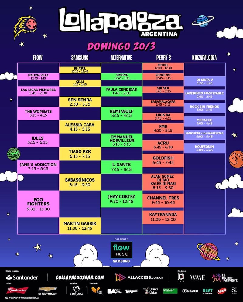 Por último, cierran el festival el domingo 20 los Foo Fighters, Martin Garrix, Babasónicos, Jane's Addiction, Jhay Cortez, Tiago PZK, L-Gante, Kaytranada, Phoebe Bridgers, Alessia Cara, Idles, Remi Wolf, Channel Tres, Emmanuel Horvilleur, ACRU, FMS, Kaleb Di Masi Alan Gomez, DJ TAO, The Wombats, Goldfish, Luck Ra, Sen Senra, Paula Cendejas, Saramalacara, Malena Villa, Las Ligas Menores, Celli, BB ASUL, Six Sex, Simona y Ronpe 99'.