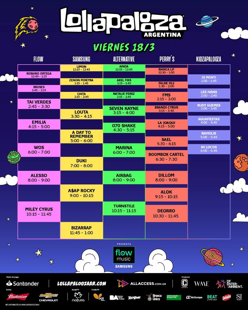 La programación comienza el viernes 18 con Miley Cyrus, A$AP Rocky, Aless, Duki, Bizarrap, Wos, Marina, A Day To Remember, Turnstile, Deorro, Louta, Emilia, FMS, Alok Boombox Cartel, Seven Kayne, Dillom, 070 Shake, Natalie Pérez, Tai Verdes Sael, Chita, Axel Fiks, Bruses, La Joaqui, Ainda, Rosario Ortega, Falke 912 Zenon Pereyra y Bianca Lif y Limon. C Tangana anunció el martes que cancelaba su presentación y fue reemplazado por Alesso.