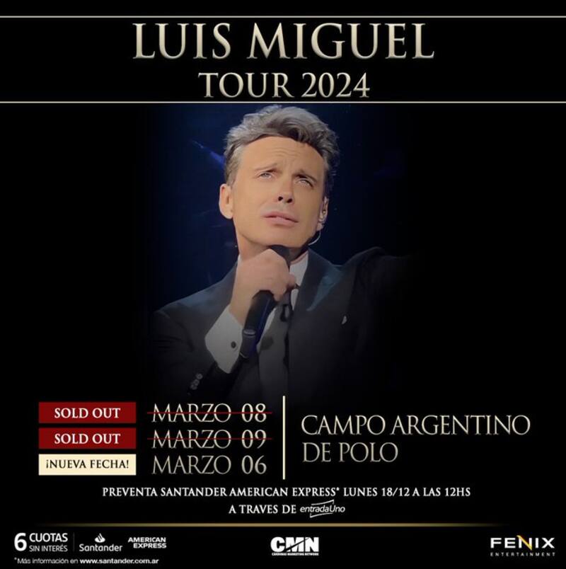 Luis Miguel volverá a la Argentina en marzo 2024 con tres nuevas presentaciones después de dar 10 shows este año en el Movistar Arena. El mexicano extendió su tour y dará nuevos espectáculos en Córdoba y en la Ciudad de Buenos Aires.