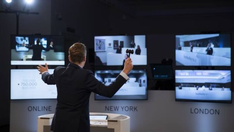 Un rematador de Sotheby's frente a tres pantallas. Es Oliver Baker con la visión de Londres, Nueva York y Hong Kong con salas vacías pero recibiendo ofertas.