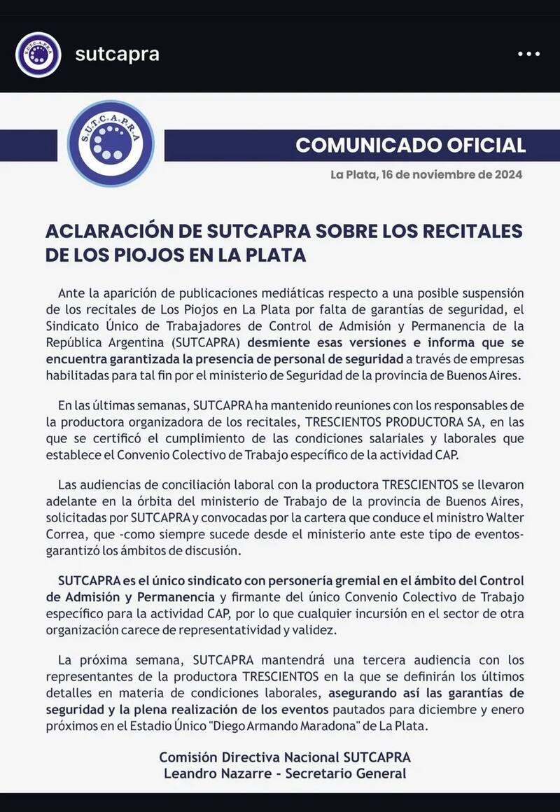 "SUTCAPRA ha mantenido reuniones con los responsables de la productora organizadora de los recitales, TRESCIENTOS PRODUCTORA S.A, en la que se certificó el cumplimiento de las condiciones salariales y laborales que establece el Convenio Colectivo de Trabajo específico de la actividad CAP", detallaron.