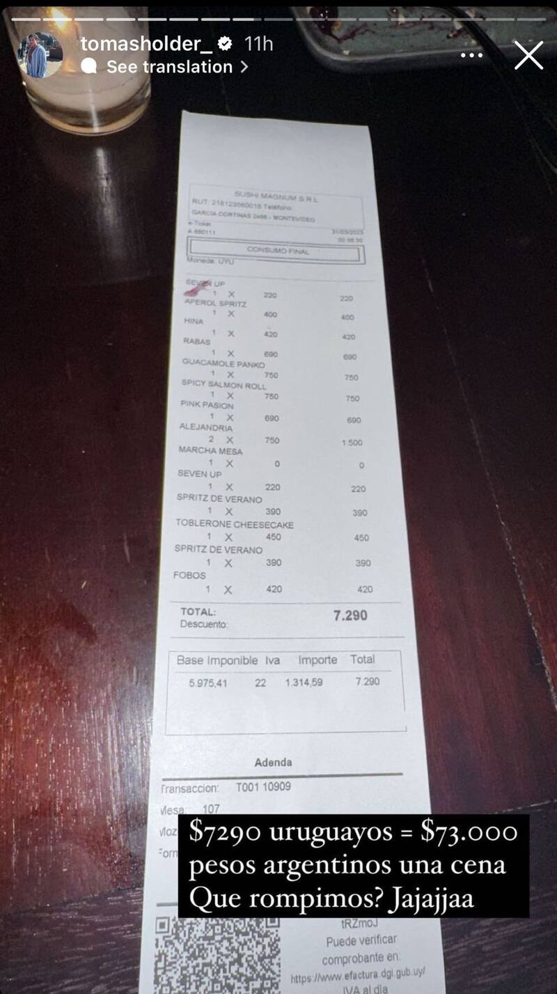 En el resumen, se debía pagar $ 7.290 uruguayos por un salmón, una ensalada alejandría, una entrada de rabas y un postre. En la conversión, Holder calculó que la cifra equivaldría a unos $ 73.000 en Argentina.