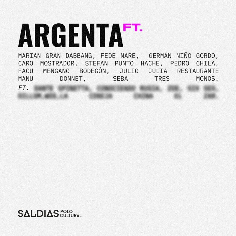 «Argenta.ft» se presenta como una iniciativa icónica: en cada sala del Polo Cultural Saldías, los cocineros piensan ofrecer un menú especial que va a ser «maridado» con presentaciones de distintas bandasy solistas en vivo. Una situación a la que se accede en grupos reducidos y por un tiempo limitado. Una noche que será, para los participantes, una «degustación extrema de arte culinario y musical». A su vez, los creadores de Argenta.ft, Lucas Pombo y André Parisier, presentan esta primera edición como «un grito argentino».