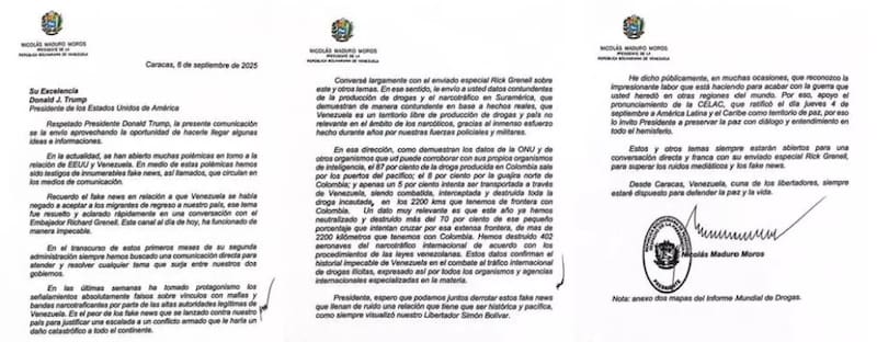 En la carta enviada el 6 de septiembre y divulgada por medios internacionales, Maduro explicó a Trump que sostuvo un diálogo con el enviado especial Richard Grenell, en el cual abordaron el narcotráfico en Suramérica. Según el mandatario venezolano, los datos presentados "demuestran de manera contundente, con base en hechos reales", que Venezuela no produce drogas ni representa una amenaza significativa al narcotráfico internacional.
