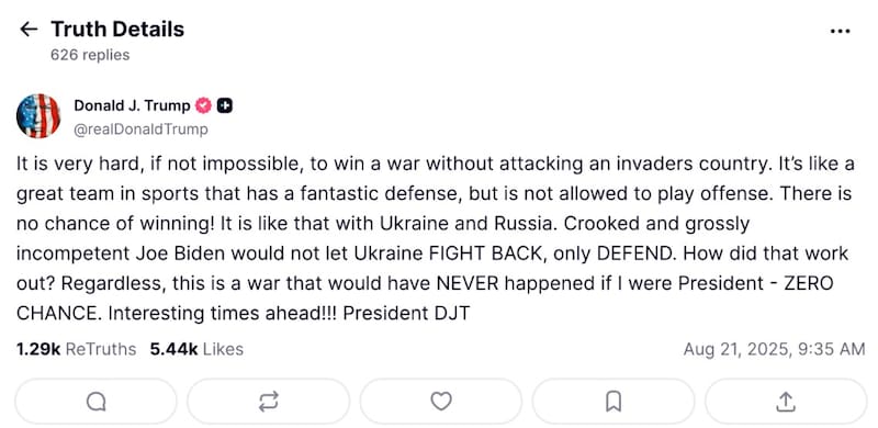 Donald Trump afirmó que Ucrania necesita "jugar al ataque" si quiere tener alguna posibilidad de victoria frente a Rusia. En Truth Social, comparó la situación militar del país con "un gran equipo que tiene una defensa fantástica pero al que no se le permite jugar al ataque" y sentenció que "¡no hay posibilidad de ganar!" sin un enfoque más agresivo.