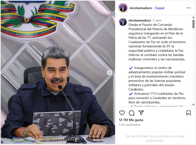 En una publicación de Instagram, Nicolás Maduro informó que se han activado los Cuadrantes de Paz en todo el territorio nacional, una estrategia de seguridad que divide las zonas urbanas en sectores más pequeños para mejorar el control y fortalecer la "seguridad pública y ciudadana" de Venezuela.