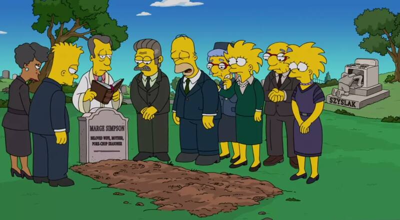 El episodio final de la temporada 36 de Los Simpson muestra a Bart y Lisa más distanciados que nunca 35 años en el futuro. En ese tiempo distante, se revela que Marge ha muerto y se puede ver su funeral con Homero llorando junto a su tumba.