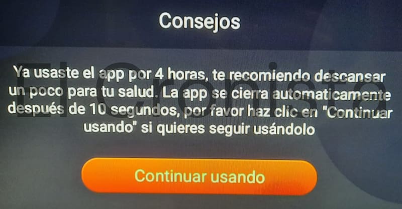 Magis TV ha implementado un mensaje que aparece después de cuatro horas de uso, recomendando a los usuarios descansar para cuidar su salud. El texto especifica: "Ya usaste por 4 horas la app, te recomiendo descansar un poco por tu salud. La app se cierra automáticamente después de 10, por favor haz clic en "Continuar usando" si quieres seguir usándolo".