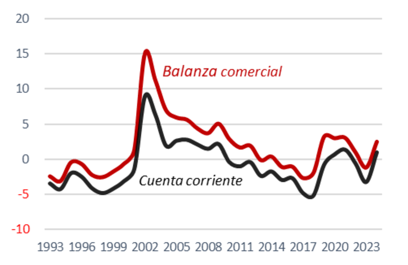 En 2024 Argentina tuvo un superávit de cuenta corriente equivalente al 1% del PIB. Pero hace poco se conoció que el saldo del primer trimestre fue negativo en casi USD 5.200 millones y esto contrastó notoriamente con los cuatro trimestres del año pasado, cuando los saldos fueron positivos y le permitieron al país acumular un superávit anual de USD 5.700 millones.