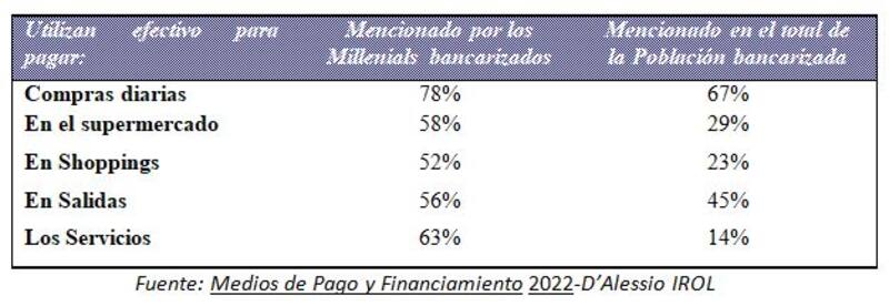 A diferencia de lo que puede creerse, los jóvenes mencionan el uso de efectivo para pagar en comercios de cercanía en un 78% de los casos, vs. el 67% de respuestas para el total de los diferentes segmentos de edades. De igual modo, lo mencionan como medio de pago en supermercados en 58% de los respondientes, a diferencia de la población en general que lo hace en un 29%.